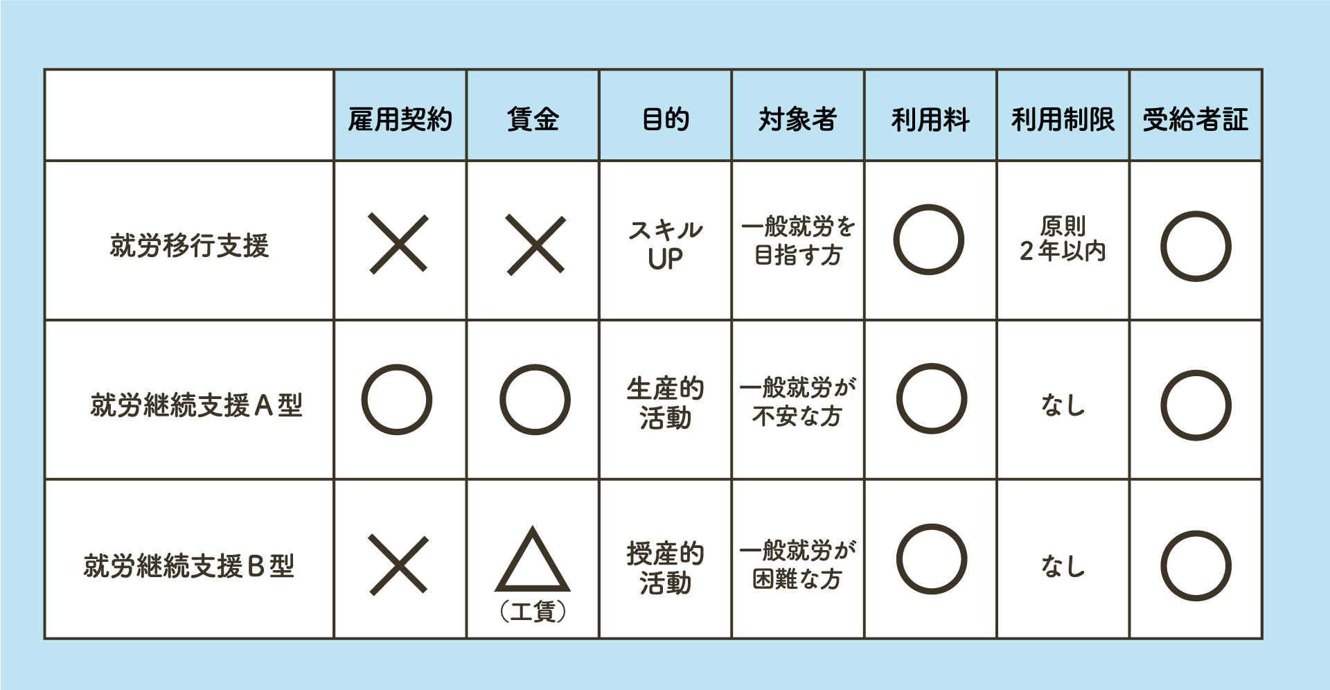 就労移行支援・就労継続支援A型・就労継続支援B型との違い